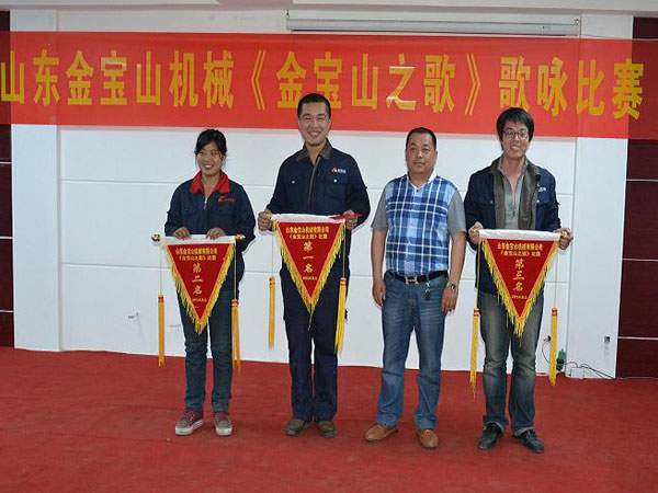 經過激烈的角逐,評委組從歌曲內容、隊員精神狀態、演唱技巧、著裝整齊度等方面進行現場打分,分別評出了一、二、三等獎。銷售管理部力壓群芳,獲得了本次比賽的第一名,生產服務科屈居第二,人力資源部獲得第三名?! ?BR style="FONT-FAMILY: "> 房士奎總經理對獲獎隊伍進行頒獎并發表了講話,房總說,在當前生產任務比較繁重的情況下開展歌詠比賽,一是緩解員工精神壓力,二是鼓舞斗志,凝聚人心,三是豐富職工文化生活,希望大家在生產中要像歌中唱的一樣,牢記“憨孝誠”的企業文化理念,打造精品闖世界,珍惜金寶山的品牌,為客戶提供最完美的破碎機。